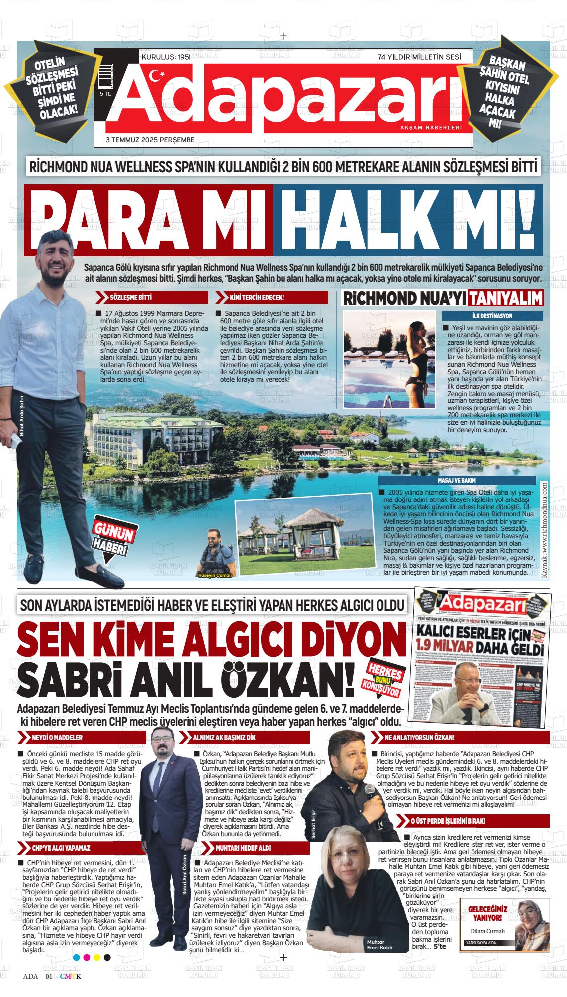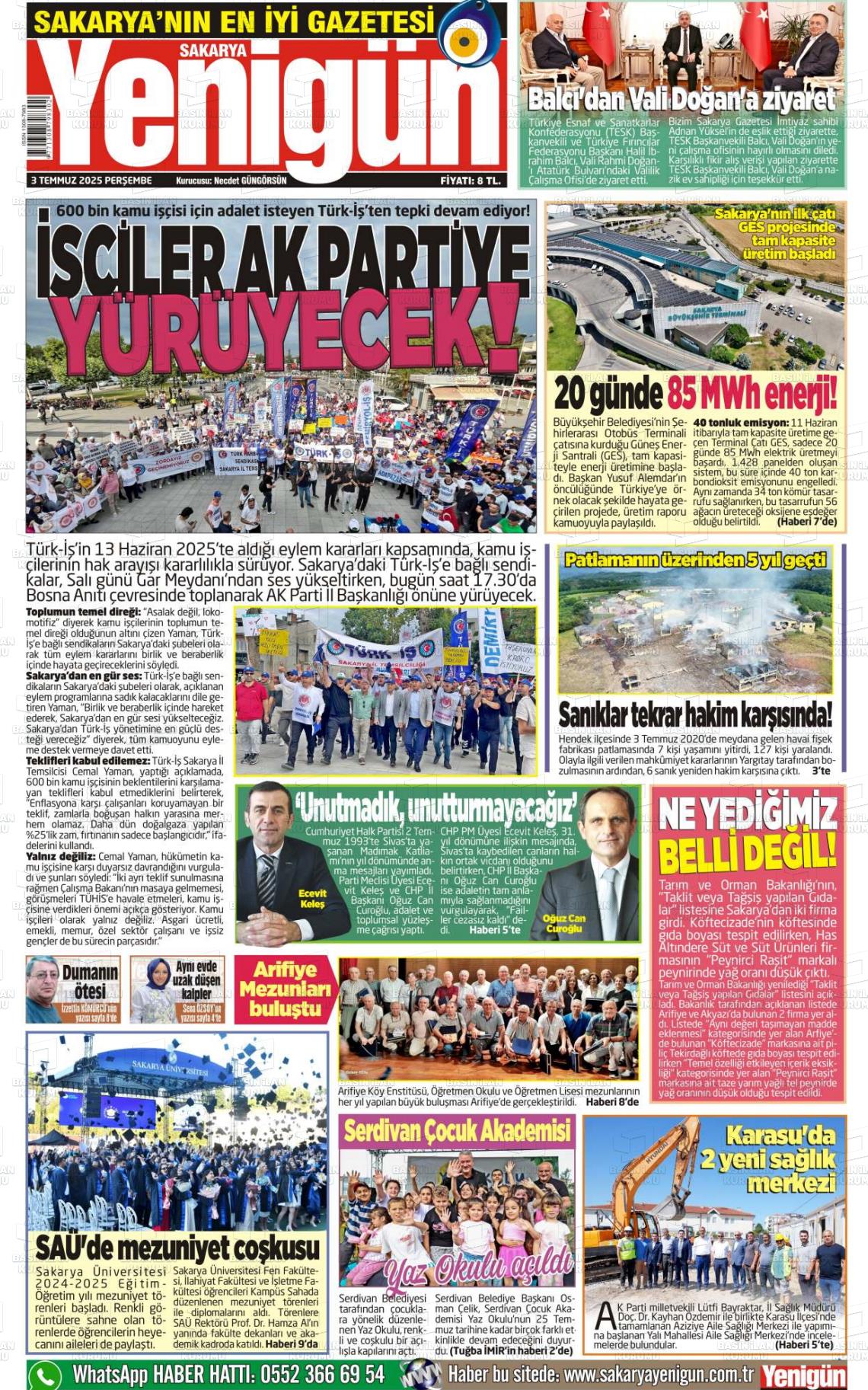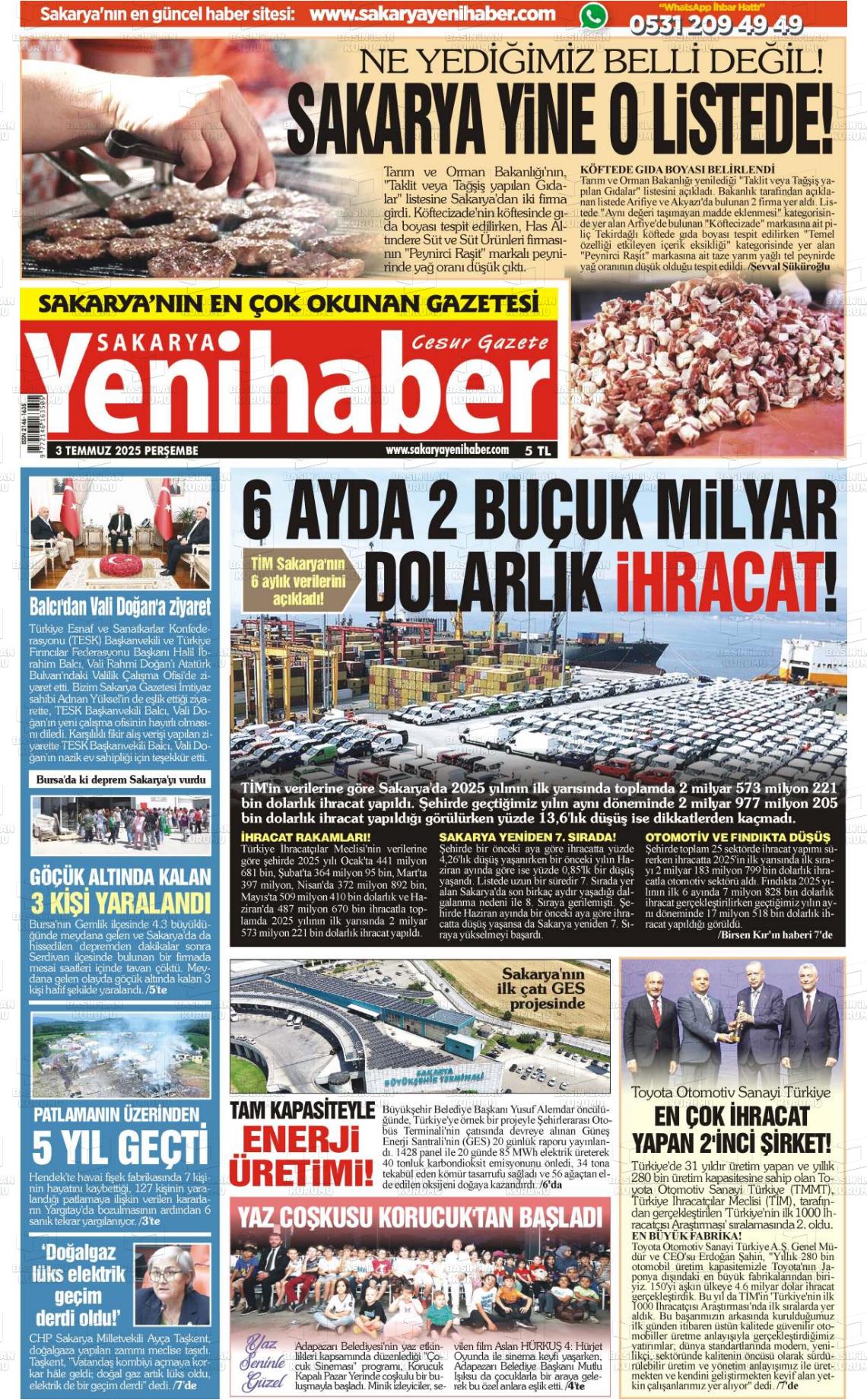 Sakarya Yerel Gazeteleri 02 Şubat 2026, Pazartesi Günü Manşeti